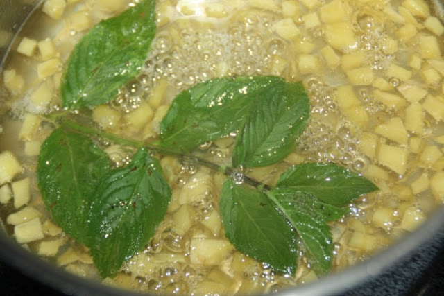 dann nehmt ihr das ganze von der heißen Platte, gebt die Zitronenschale und Minze hinzu und lasst es im Topf auskühlen.